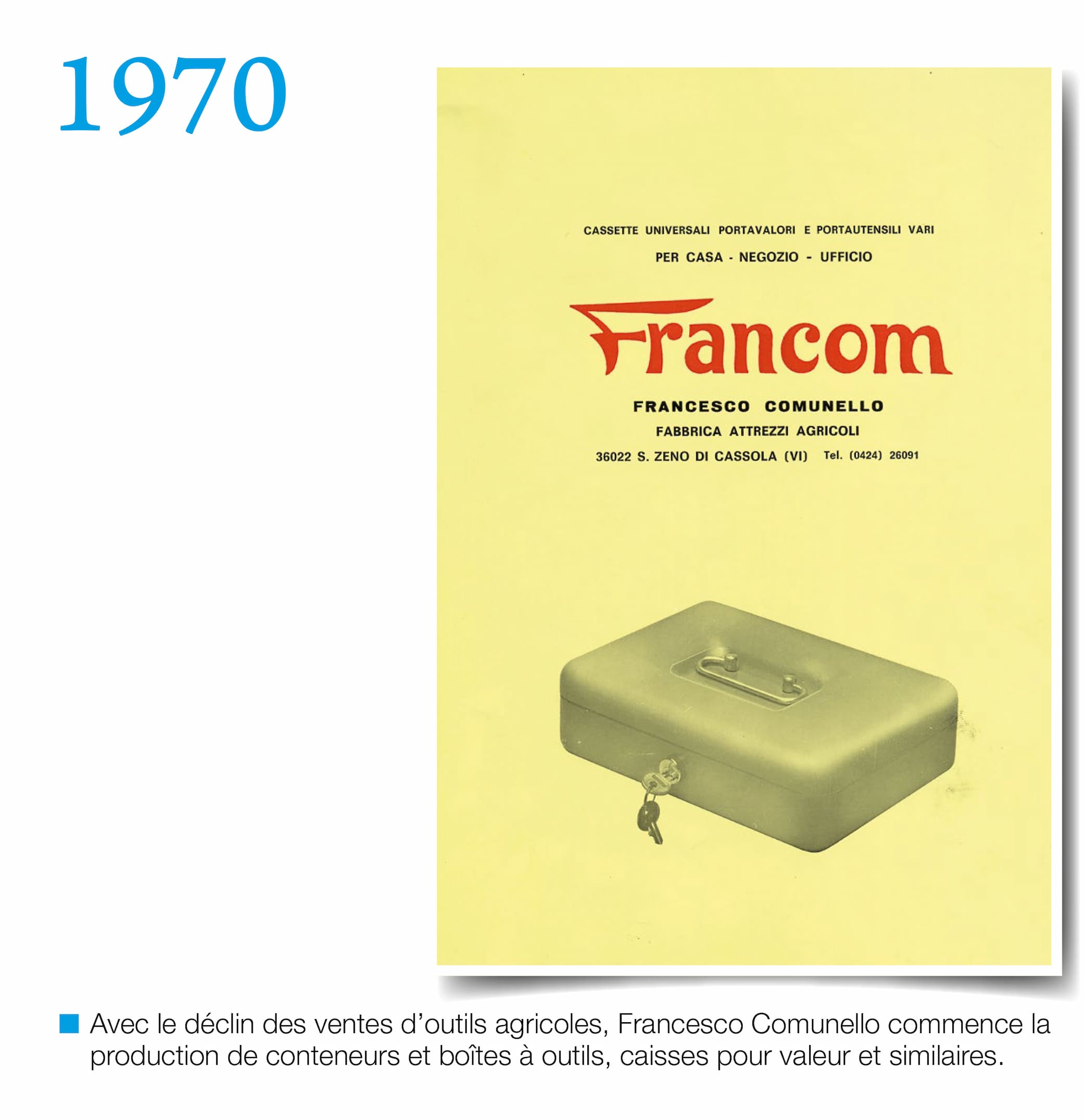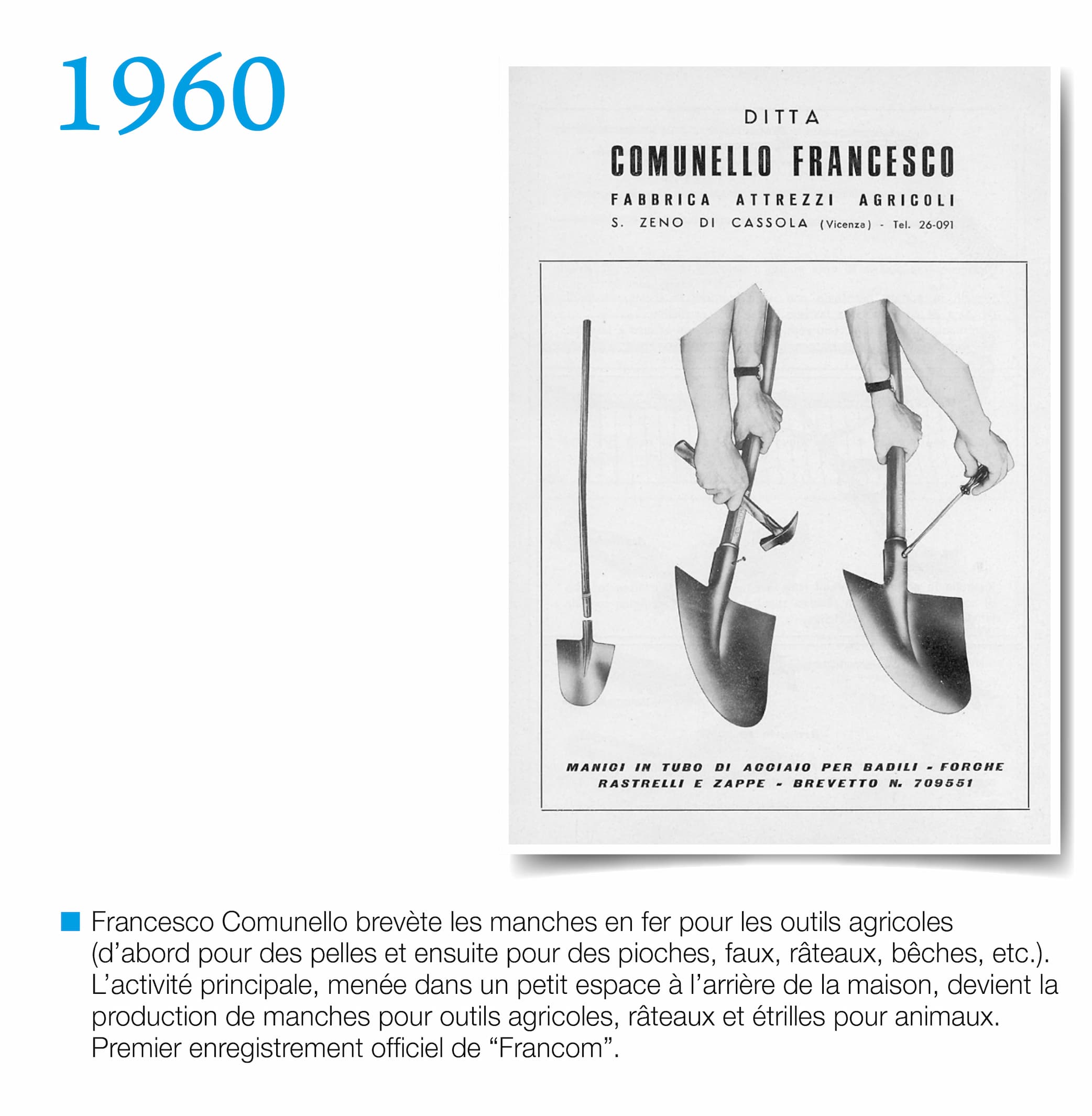 En 2020 Francom Spa fêtait ses 60 ans : l’entreprise a célébré cet anniversaire important avec la publication d’un livret qui retrace les étapes principales de son histoire, avec des mots mais surtout avec des images significatives . Des années avant 1960, date du premier enregistrement avec la dénomination Francom de l’activité de production d’outils pour l’agriculture de la part de Francesco Comunello, jusqu’en 2020. Entre ces deux dates, de nombreux évènements qui ont porté l’entreprise vers sa configuration actuelle.